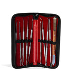 The 10pc Dab Tool Set with Carrying Case is a must-have for anyone who loves to get their dab on. A concentrate tool set features 10 single tipped dab tools with various tip styles. Coming in a black leather carrying case with red vinal insides, these tools are fully protected, allowing them great portability whenever a session may occur. Keep tools organized and clean with the help of a 10pcs Dab Tool Set with Carrying Case.