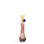 The Gold Rim Chillums is a conical pipe made for dry herb use. Traditionally made from clay or soft stone, it is crafted from durable borosilicate glass making it ideal for longevity. It is compact allowing users to take it on the go in their hand or pocket. Allowing use whenever, wherever the chillum utilizes a bowl where the user would pack their herbs and enjoy. A tip; do not overpack the piece as it will restrict the airflow. Additionally, the Gold Rim Chillums incorporates a blue dot leg which helps prevent it from rolling over.