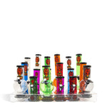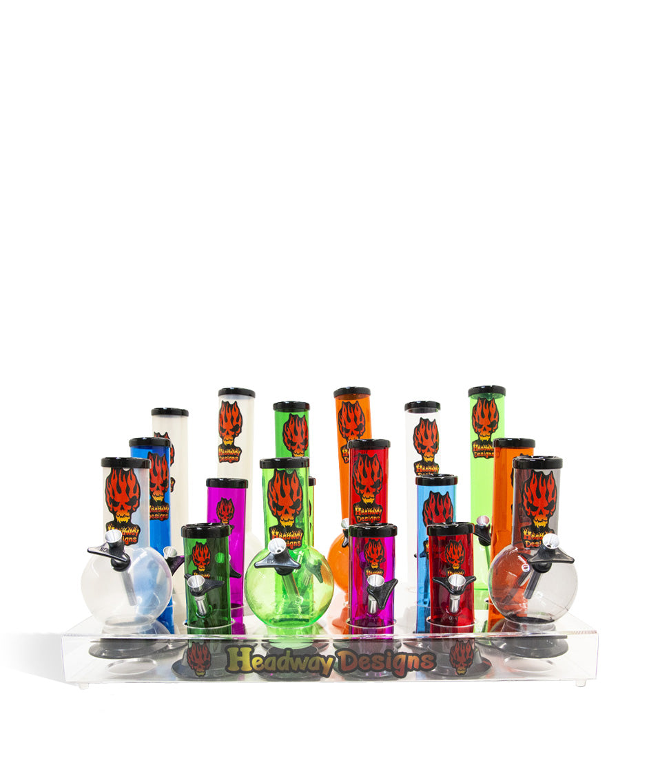 Los kits de exhibición básicos de Headway están disponibles en 18 pipas de agua acrílicas de colores surtidos. Esto incluye 3 tubos de agua rectos de 6, 8 y 10 pulgadas cada uno. También tiene 3 tubos de agua de burbujas de 8 y 12 pulgadas cada uno.
